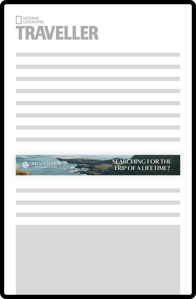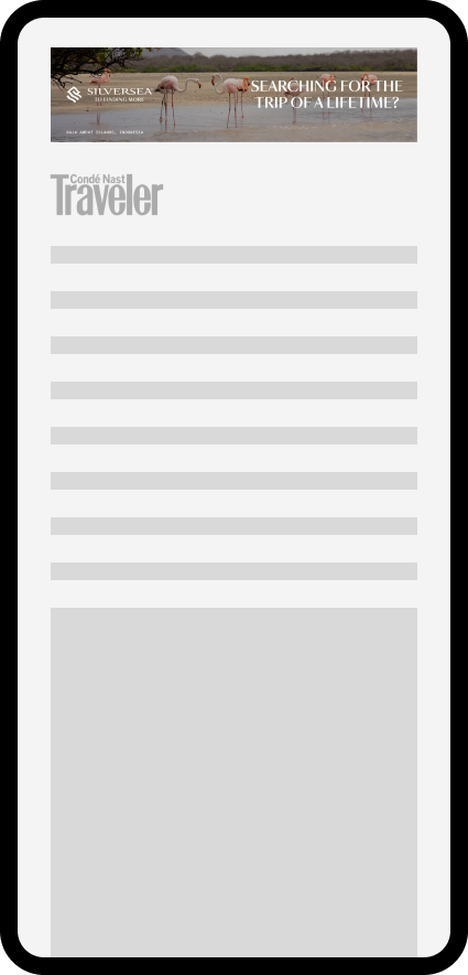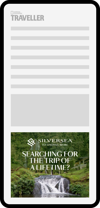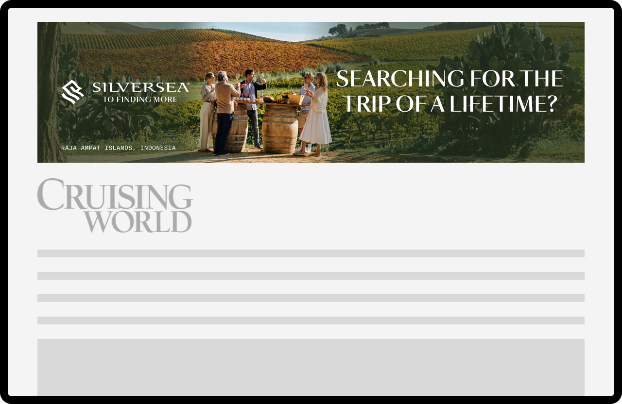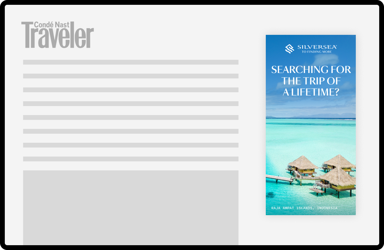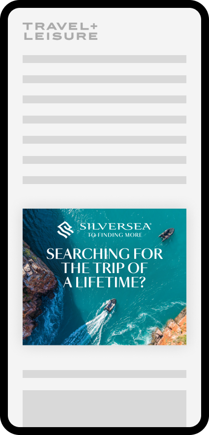 This project involved developing a suite of banner ads for Silverseas. While the copy and location would be dynamically populated, each layout required carefully customized imagery to suit its unique dimensions and maintain strong legibility. Because the visuals were central to conveying destination appeal, the challenge was to optimize every asset so the imagery remained clear, inviting, and cohesive across the entire banner set.